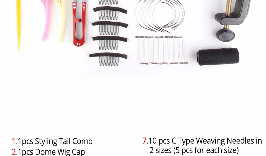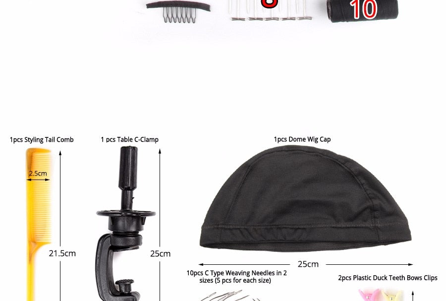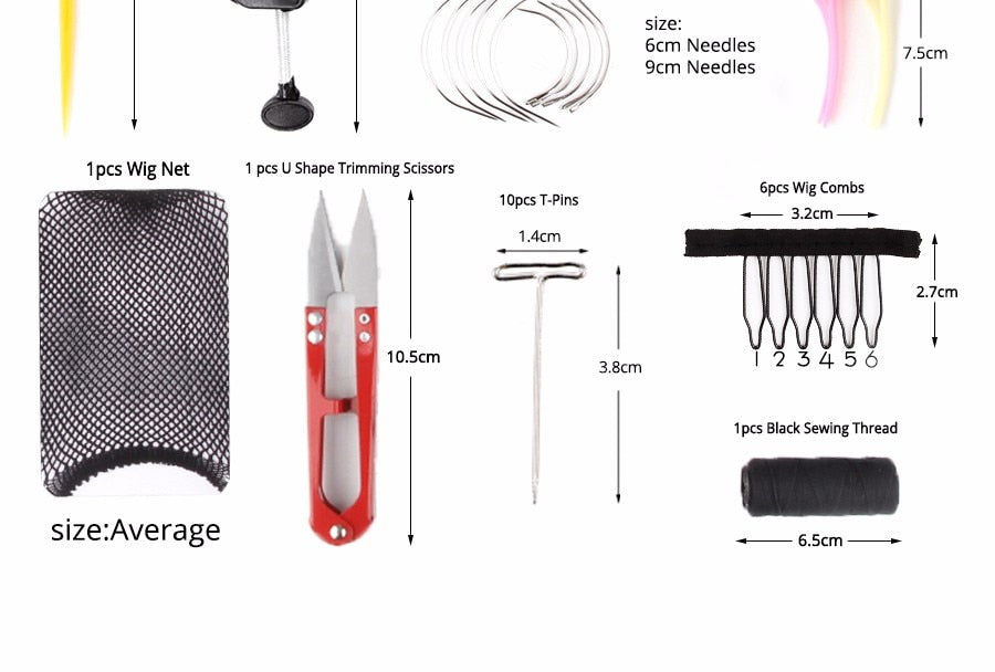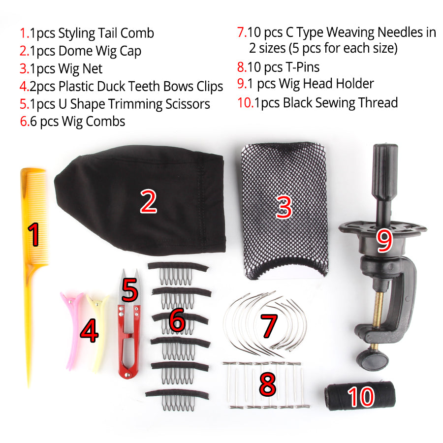 1pcs styling tail comb, 1 pcs dome wig cap, 1 pcs hair net, 2 pcs plastic duck teeth bows clips,1 pcs U shape trimming scissors, 6 pcs wig comb,10 pcs Curved Needles, 10 pcs T pins, 1 pcs wig head holder, 1 pcs black sewing thread