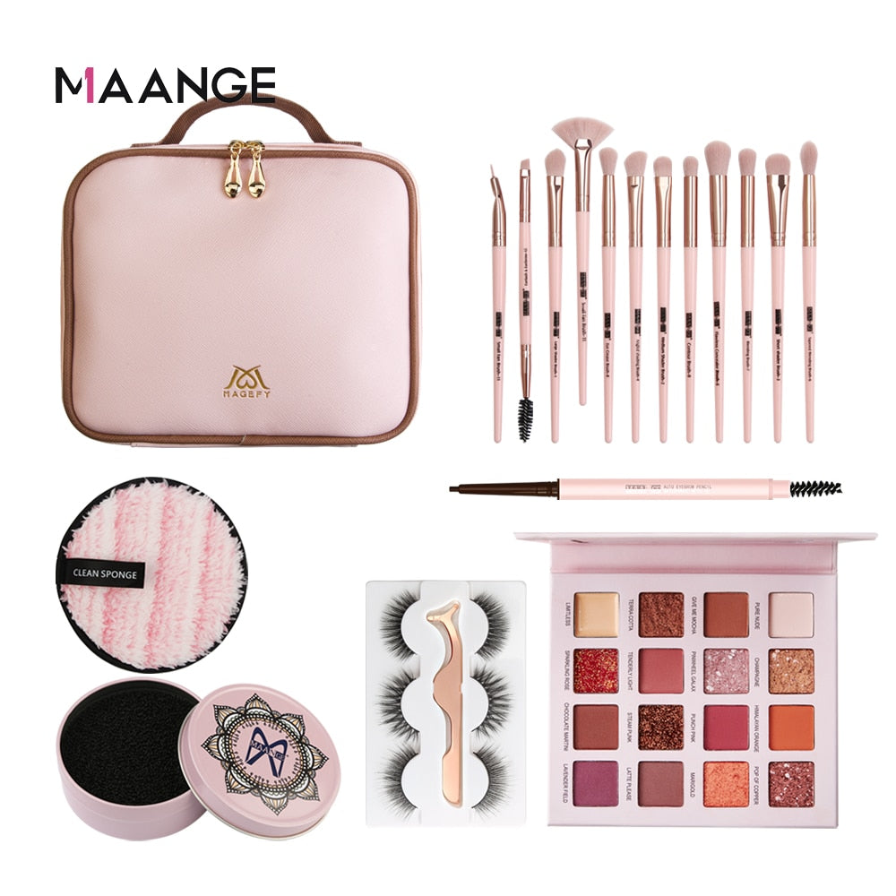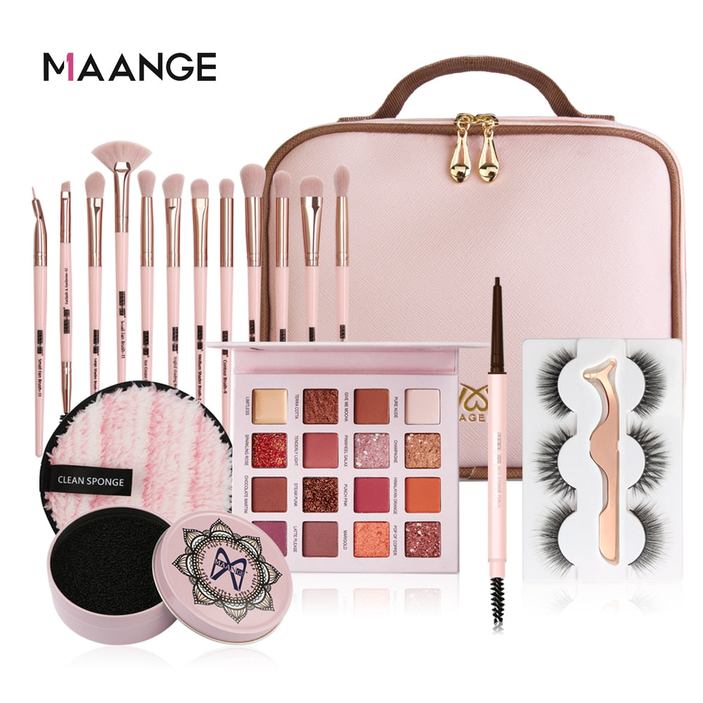 12piece/set makeup brush+1pc sponge puff+ 1 pcs brush cleaner+ 1 pc eyebrow pencil + eyeleashes+eyshadow (choose as your favour)