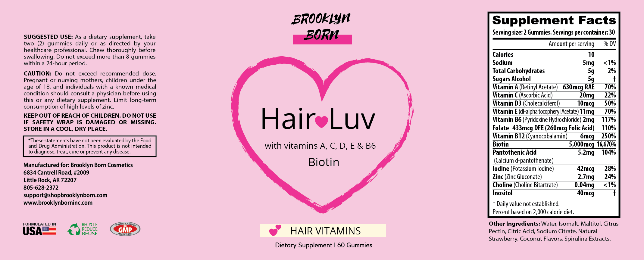 Hair Luv "Hair Care Hearts" vitamins are soft and delicious chewy hair vitamins! They are cruelty-free and made in the U.S.A. They're flavored with natural berries for a sweet taste you can enjoy!