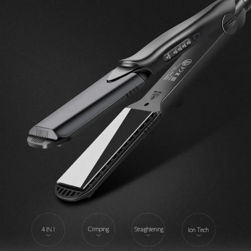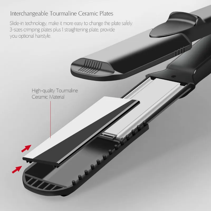 4-in-1 interchangeable plates hair styling tool, contains L wave plate, M wave plate, S wave plate, and flat plate.