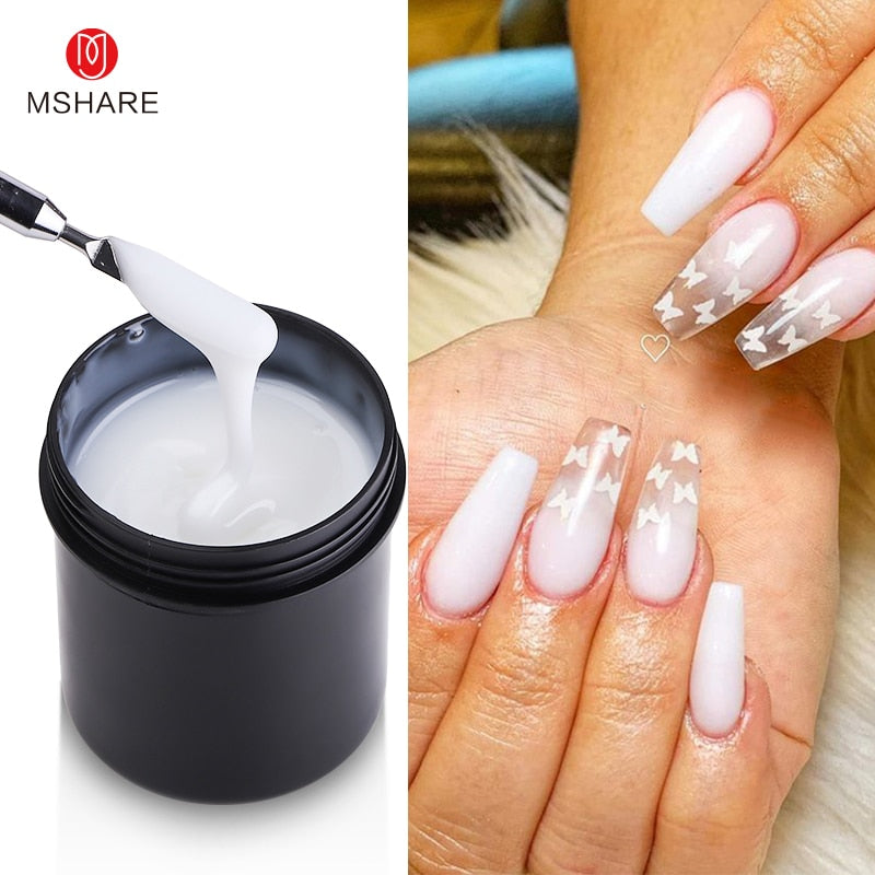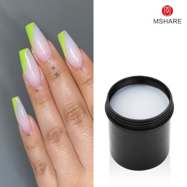 1. Shape and file the nail, remove the cuticle. 2. Apply a thin layer of basee coat, and cure it under an LED lamp for 1-2 minutes. 3. Put a nail form on your nail. 4. Apply the UV Builder Gel on the fingernail tip, cure it under the LED lamp for 1-2 minutes. 5. Apply the UV Builder Gel on the whole nail and extend it to the desired position, then cure it under LED lamp for about 30 seconds 6. Shape the side face of the nail with shaping tweezers, then cure it under an LED lamp for 1-2 minutes. 7. Take off the form, shape, and file the extended nail. 8. Clean the nail surface. 9. Design the nail. 10. Apply the top coat and cure under the LED lamp for 1-2 minutes.