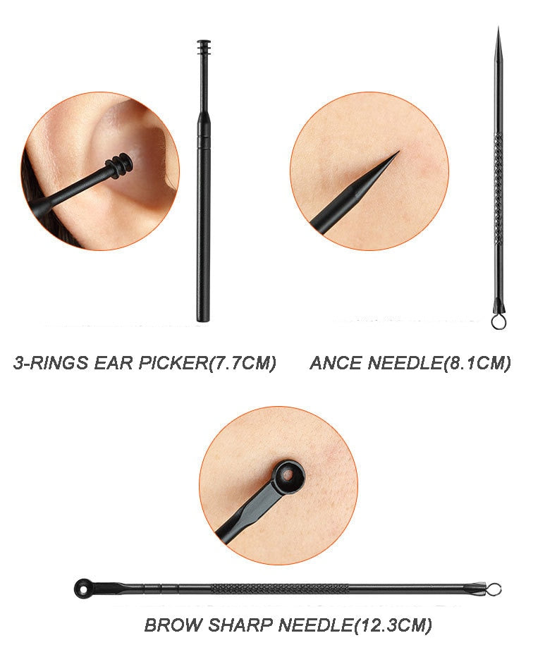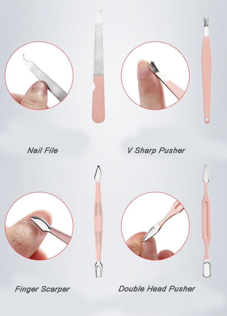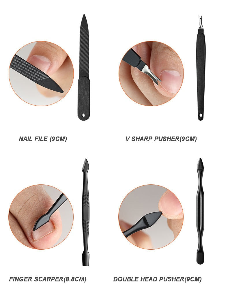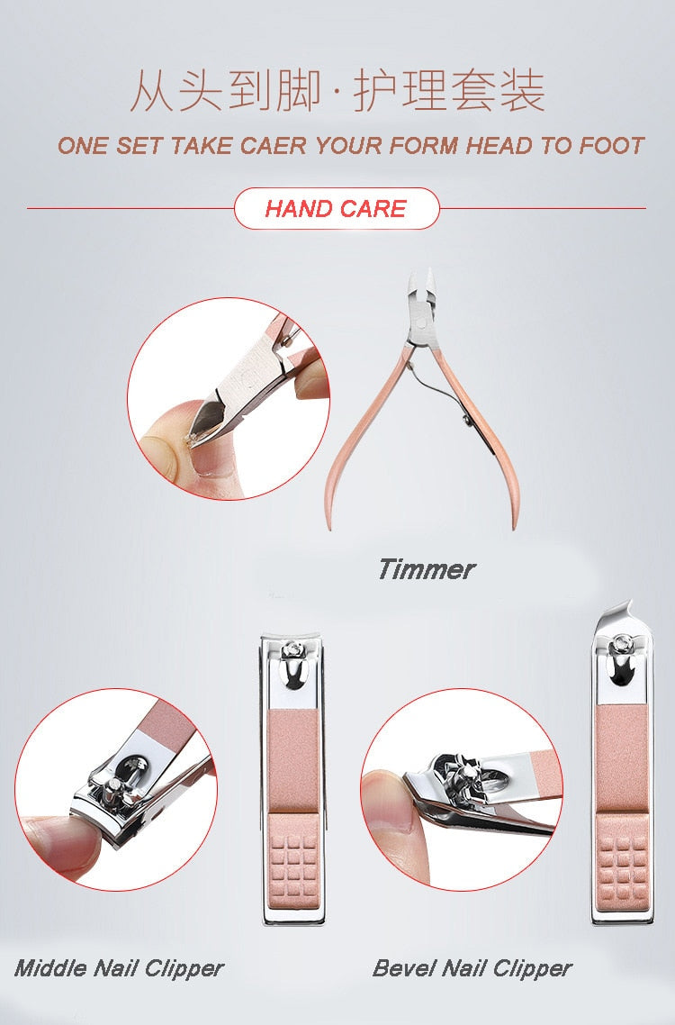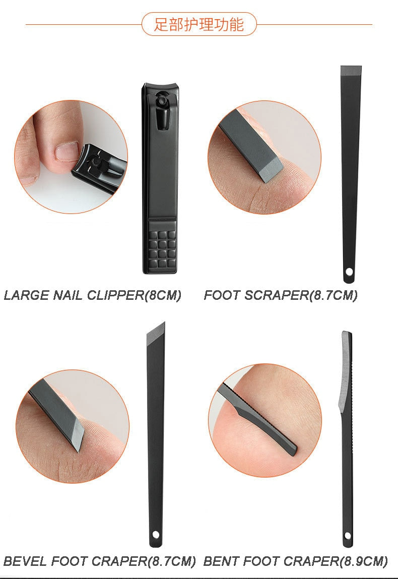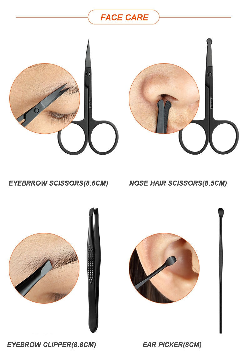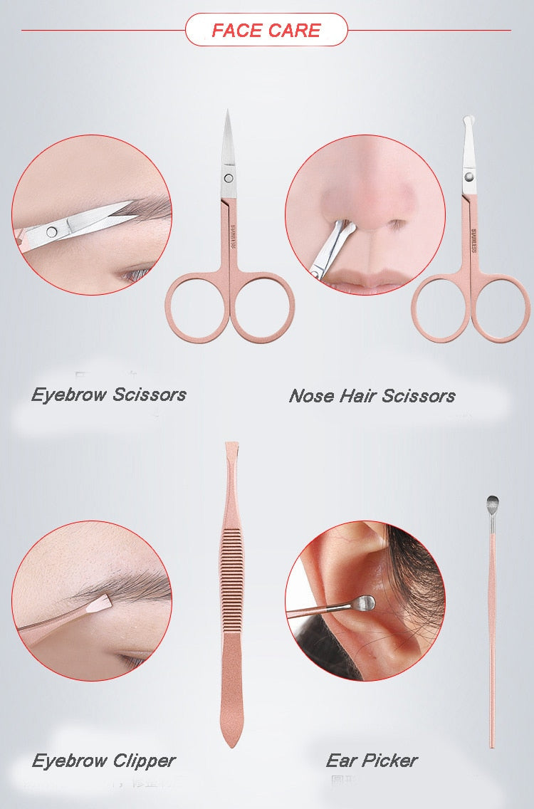 18 tools manicure & pedicure tools kit, nail clippers, cuticle trimmers, cuticle pusher, nail file, dead skin fork, eyebrow tweezers, eyebrow scissors, acne needle, ear pick, and so on are included. It will be very helpful for your daily hand care, facial care, ear care, and foot care.