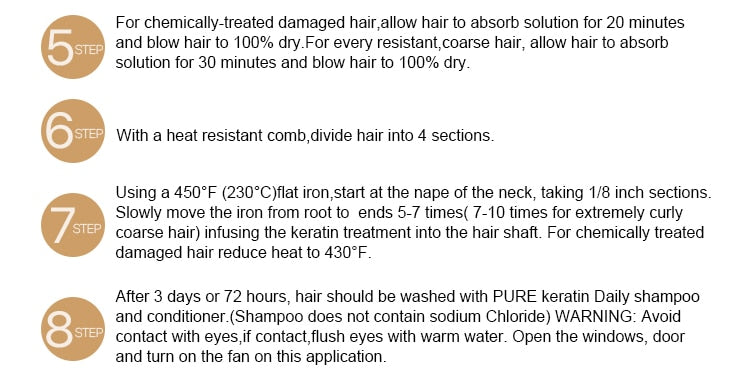 iron from root to ends 5~7 times (7~10 times for extremely curly coarse hair) infusing the Brazlian Keratin