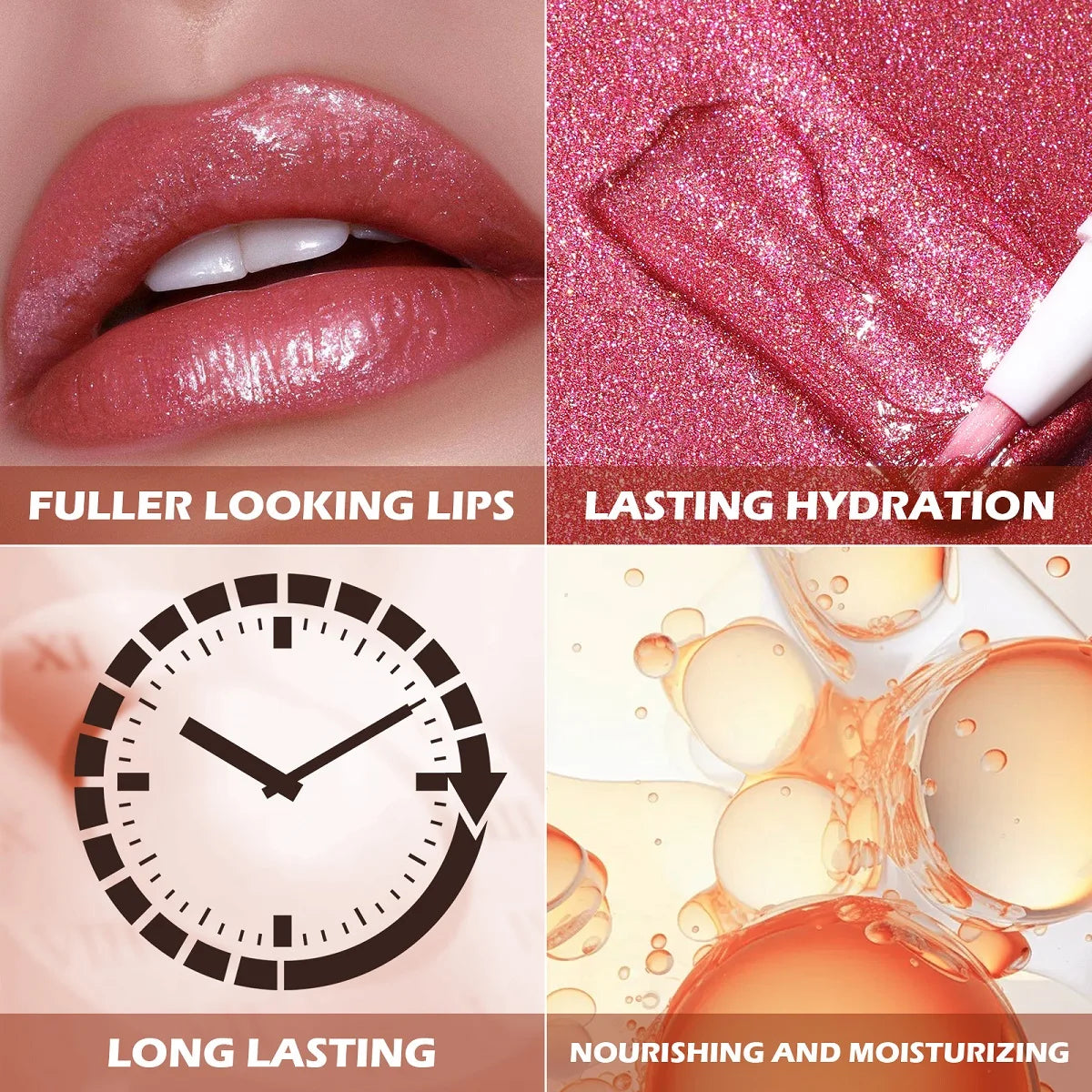 Prepare to be mesmerized! This lip gloss is infused with different shades of shimmering pearls that reflect light from various angles, creating captivating and multi-dimensional effects. Experience a dazzling burst of colors that will make your lips stand out and shine like never before.